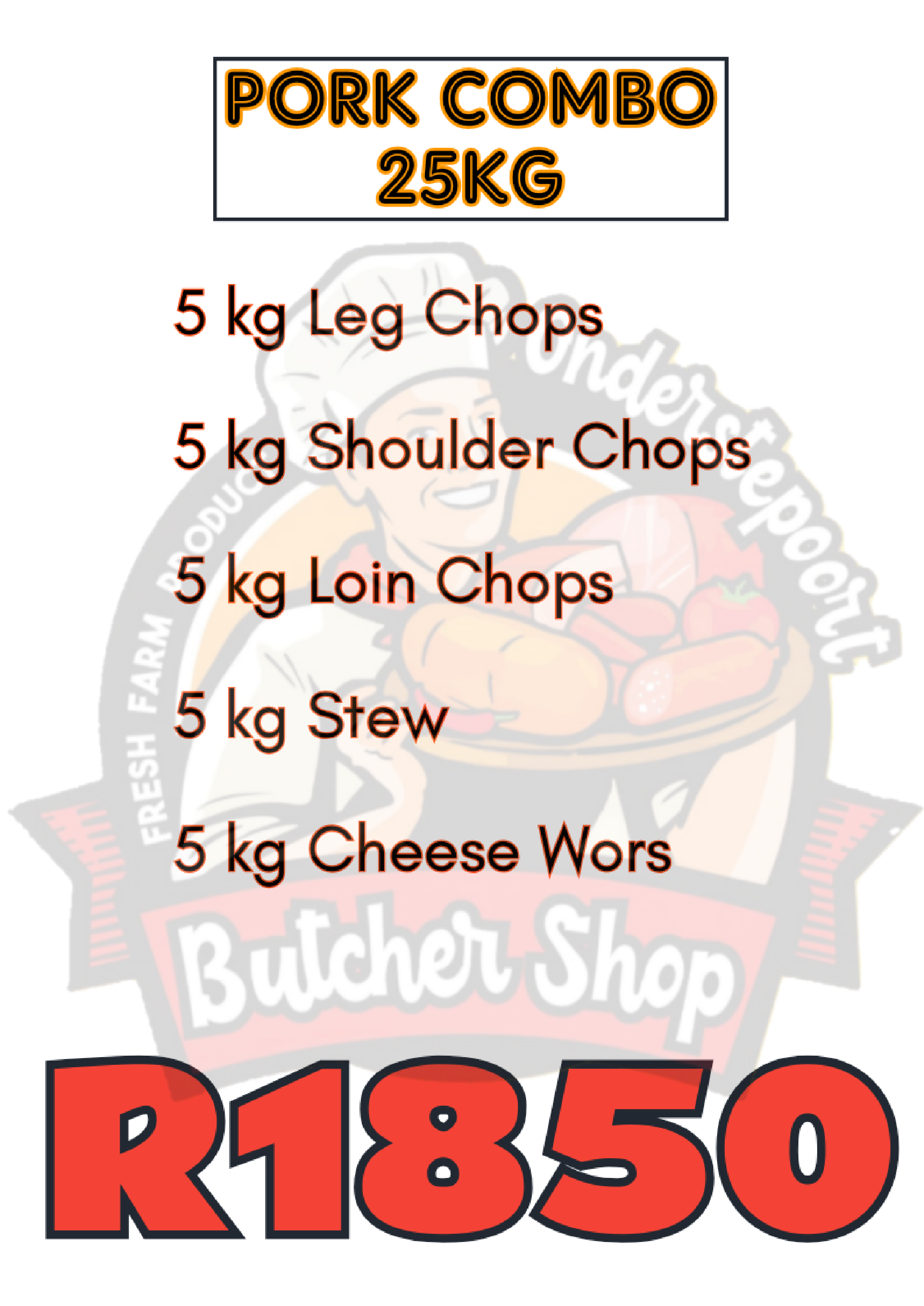 PORK COMBO 25KG: 5kg Leg Chops, 5kg Shoulder Chops, 5kg Loin Chops, 5kg Stew, 5kg Cheese wors